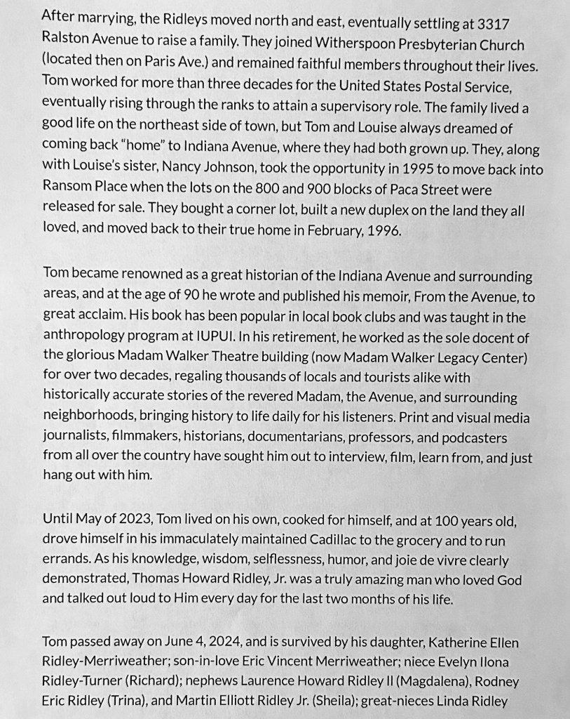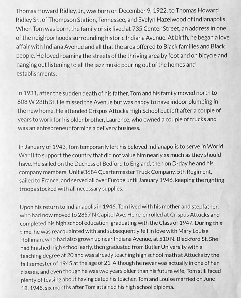 Thomas Howard Ridley: WWII D-Day Veteran, Crispus Attucks H.S. Graduate, 30+ Year U.S. Postal Service Employee, Husband, Father, Grandfather, Black Historian, Author, Madam Walker Theater Building Docent