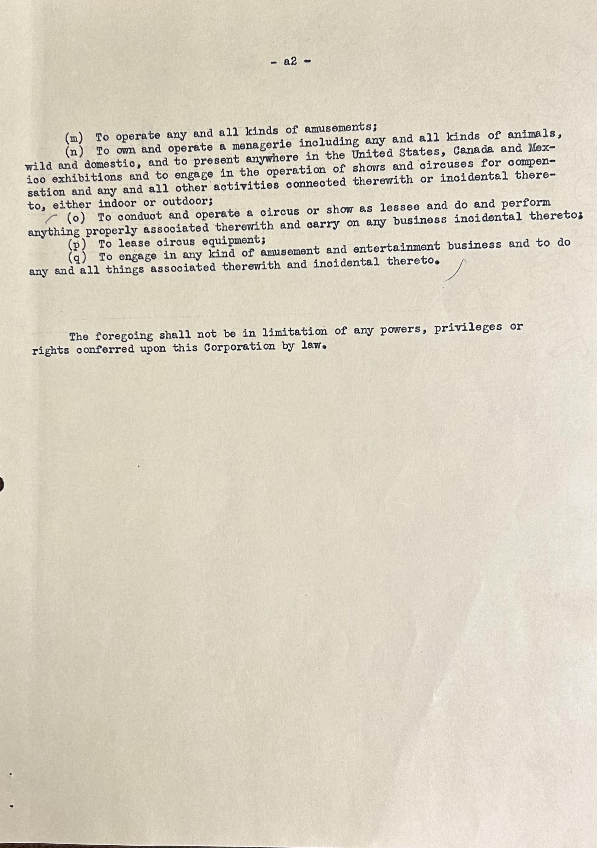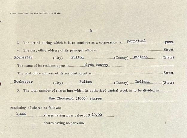 In 1935 Beatty formed the Cole Bros. and Clyde Beatty Circus and they wintered their circus in Rochester, Indiana. Beatty incorporated his own circus as the Clyde Beatty Circus, located in Rochester, Indiana in 1938. Harriet signed as a director, as did Indianapolis attorney F.E. Schortemeier.